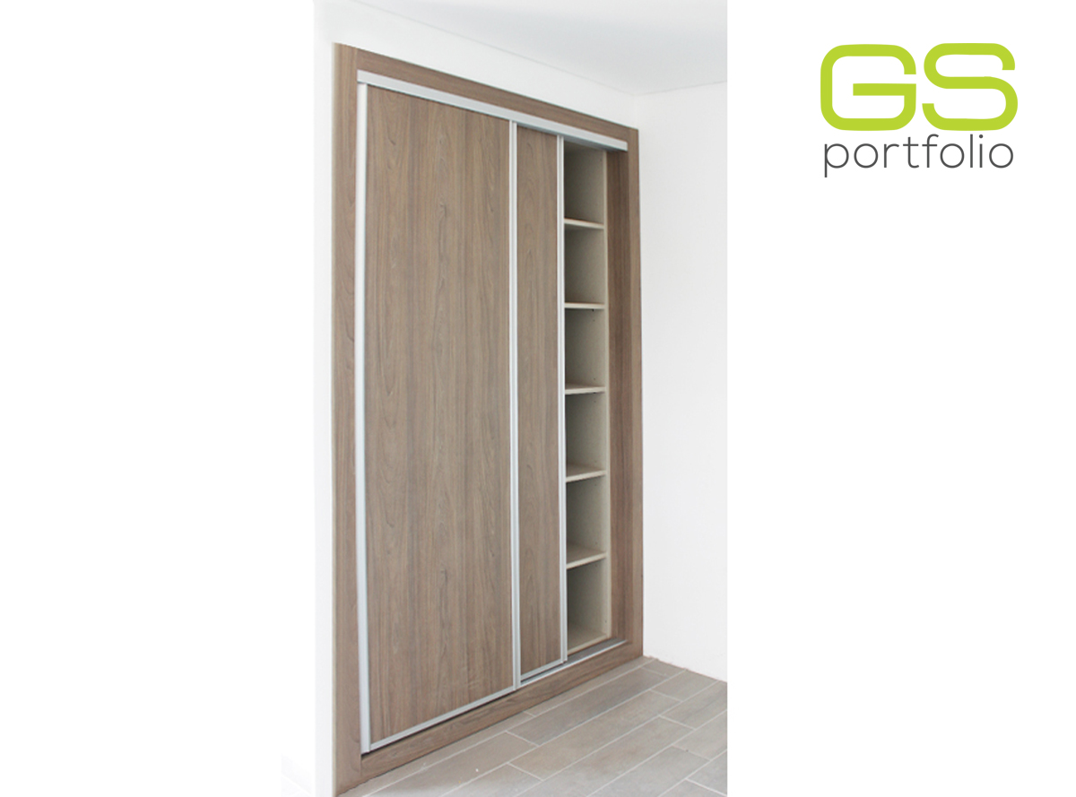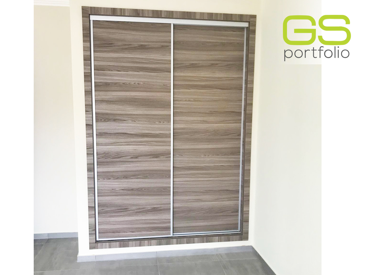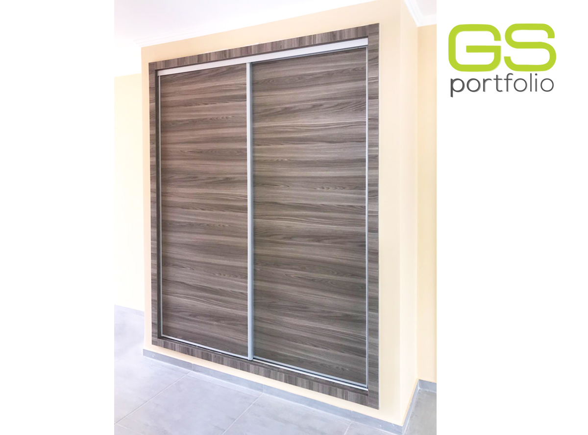 - Armario empotrado GS CONCEPT de 2 puertas correderas. Acabado en lámina vinílica: Olmo Gris y perfil lateral tirador de aluminio.