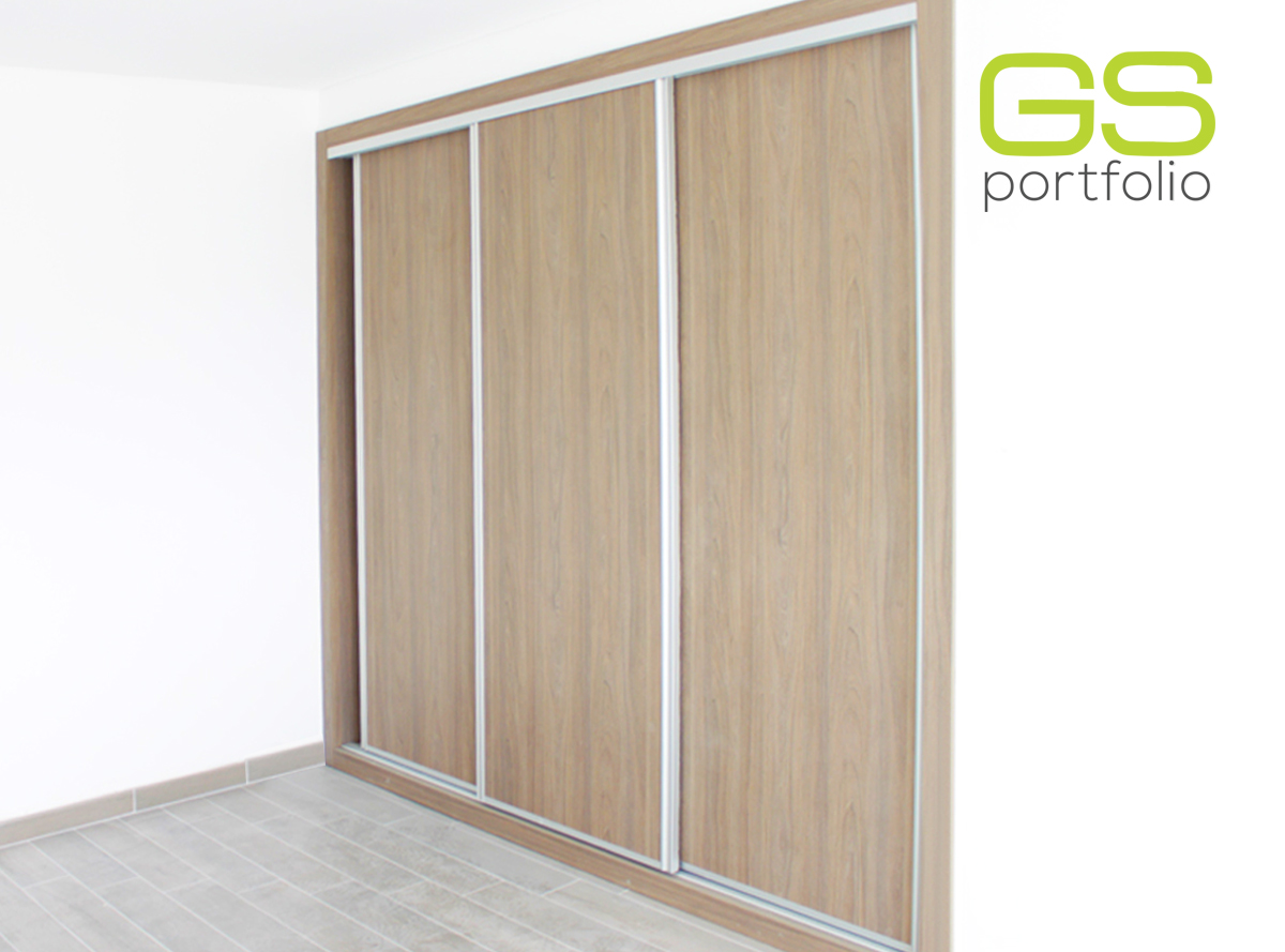 - Armario empotrado GS CONCEPT de 3 puertas correderas. Acabado en lámina vinílica: Olmo Taupe y perfil lateral tirador de aluminio.