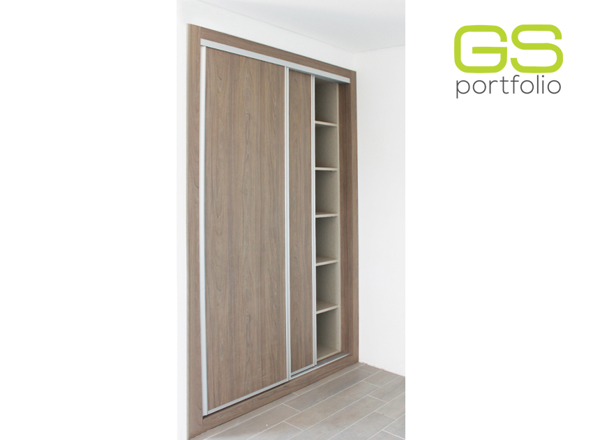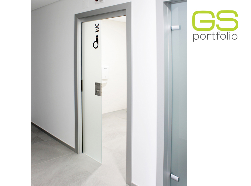 - Armazón para puerta corredera – modelo ÚNICO. Puerta de vidrio blanco mate con jamba y tapa superior en aluminio.