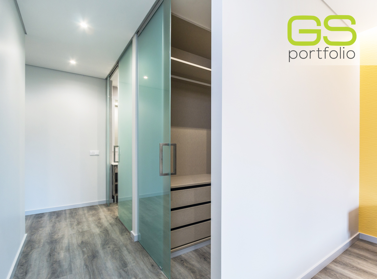 - Placard avec séparateurs, étagère à chaussures et tiroirs avec glissières cachées et système de fermeture amortie par GS CONCEPT. Compartiment fermé avec une porte coulissante en verre dépoli blanc.