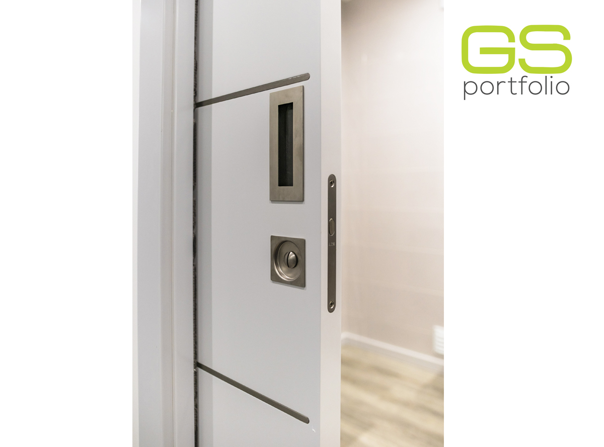 - Porte battante GS DOORS, modèle PLUS (jusqu'au plafond), en laqué blanc mat avec coins. Serrure magnétique.