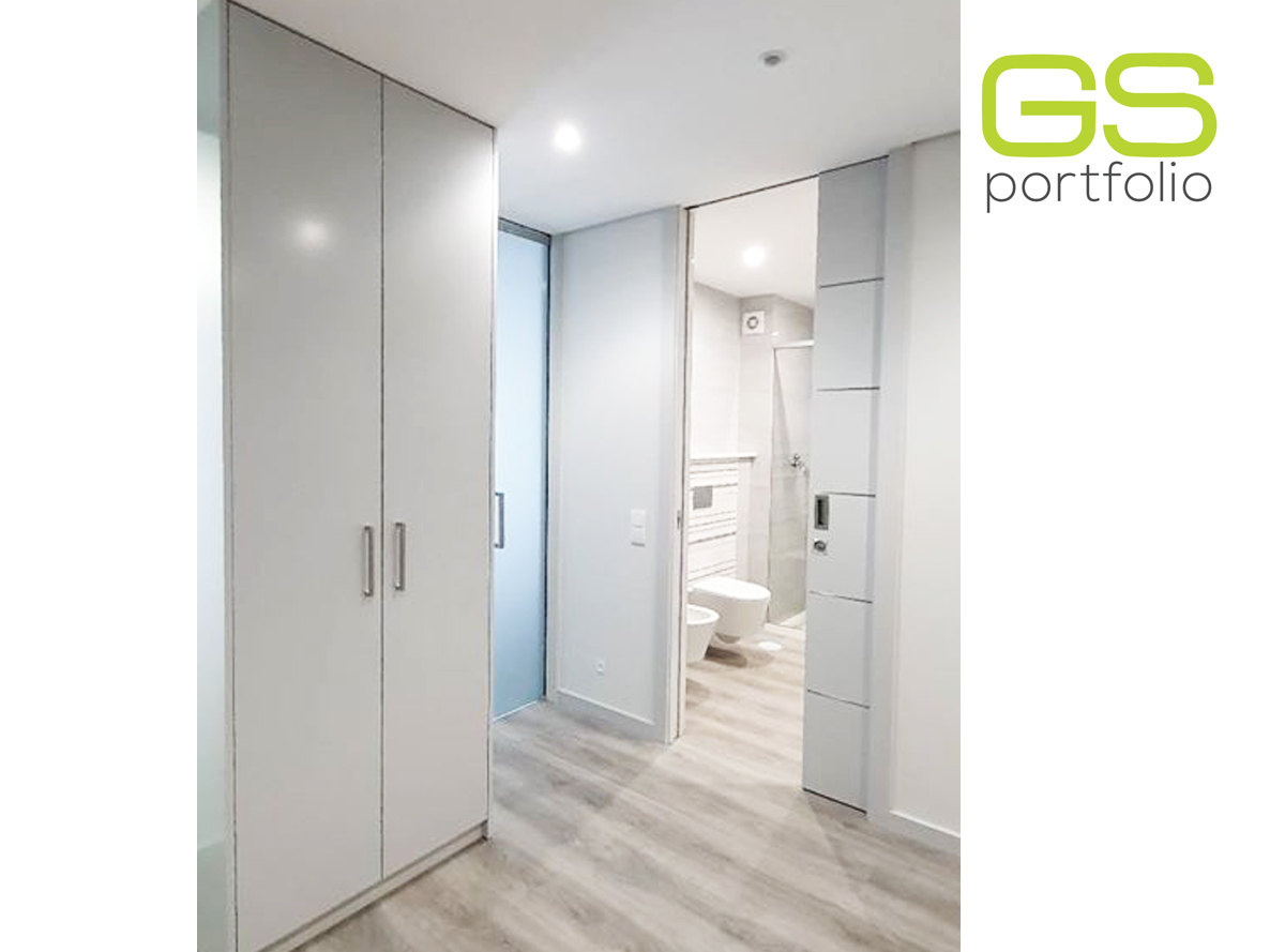 - Armoire encastrée avec portes battantes laquées blanc mat par GS CONCEPT. Tiroirs avec glissières cachées et système de fermeture en douceur.