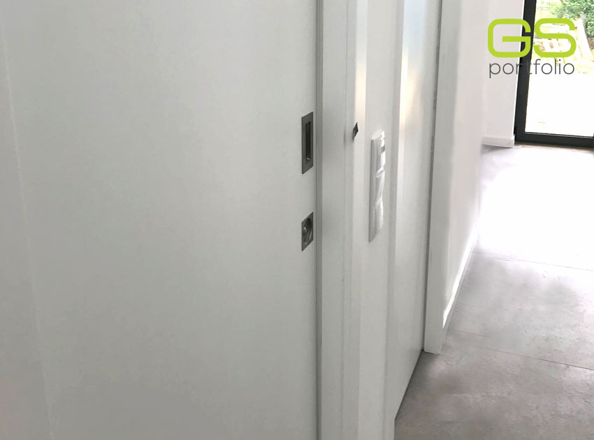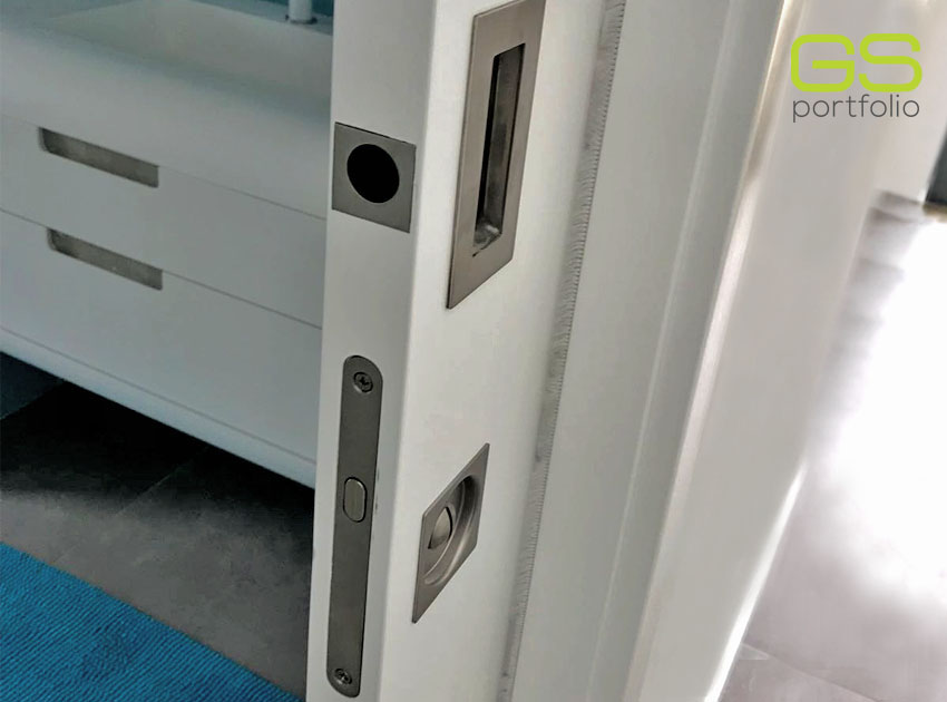 Contre-châssi UNICO avec porte, habillage et chambranle en bois laqué blanc mat. Quincaillerie appliquée: cuvette ronde d´encastrer, tire-doigt, serrure et bouton rond.